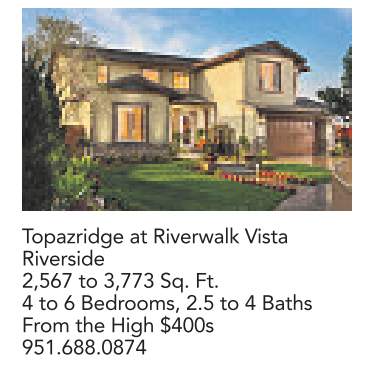 Topazridge at Riverwalk Vista Riverside 2,567 to 3,773 Sq. Ft. 4to6Bedrooms, 2.5 to 4Baths From the High $400s 951.688.0874