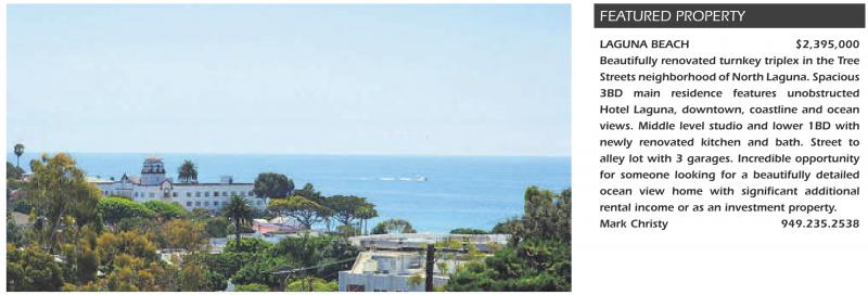 LAGUNA BEACH $2,395,000 Beautifully renovated turnkey triplex in the Tree Streets neighborhood of North Laguna. Spacious 3BD main residence features unobstructed Hotel Laguna, downtown, coastline and ocean views. Middle level studio and lower 1BD with newly renovated kitchen and bath. Street to alley lot with 3 garages. Incredible opportunity for someone looking for a beautifully detailed ocean view home with significant additional rental income or as an investment property. Mark Christy 949.235.2538