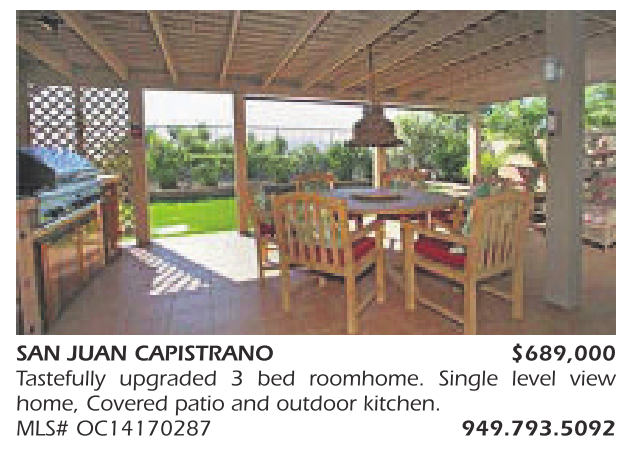 SAN JUAN CAPISTRANO $689,000 Tastefully upgraded 3 bed roomhome. Single level view home, Covered patio and outdoor kitchen. MLS# OC14170287 949.793.5092