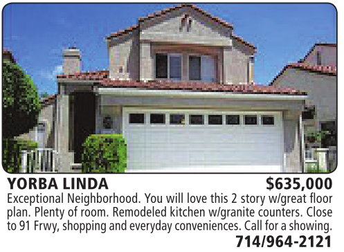 YORBA LINDA $635,000 Exceptional Neighborhood. You will love this 2story w/great floor plan. Plenty of room. Remodeled kitchen w/granite counters. Close to 91 Frwy,shoppingand everyday conveniences. Call forashowing.