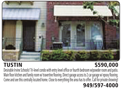 TUSTIN $590,000 Desirable Irvine Schools!Tri-level condowithentry level officeorfourth bedroomw/powder room andpatio. Main floorkitchen andfamilyroomw/travertineflooring. Direct garageaccess to 2car garagew/epoxy flooring. Come andsee this centrally locatedhome.Close to everythingthe area has to offer.Callfor privateshowing! 949/597-4000 See also