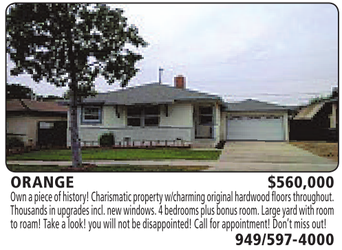 ORANGE $560,000 Ownapiece of history! Charismaticpropertyw/charmingoriginal hardwood floors throughout. Thousands in upgrades incl. new windows. 4bedrooms plus bonusroom. Large yard with room to roam! Take alook! youwill notbedisappointed!Callfor appointment! Don’tmissout! 949/597-4000 See also