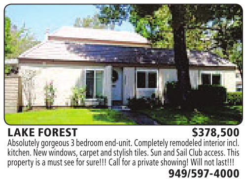 LAKE FOREST $378,500 Absolutelygorgeous 3bedroomend-unit. Completely remodeledinterior incl. kitchen. Newwindows,carpetand stylish tiles. Sunand Sail Club access.This property is amustsee forsure!!! Call foraprivateshowing!Will notlast!!!