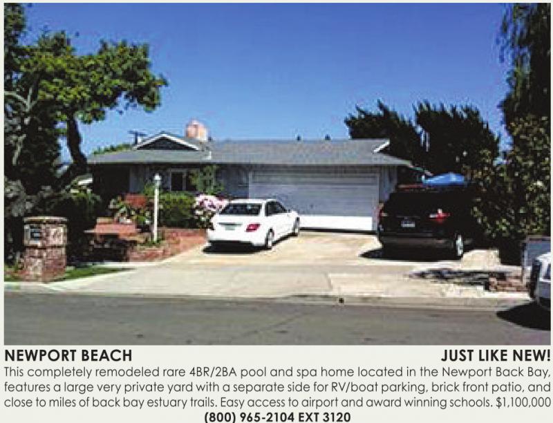 NEWPORT BEACH JUST LIKE NEW! This completely remodeled rare 4BR/2BA pool and spa home located in the Newport Back Bay, features alarge very privateyardwithaseparate side forRV/boat parking,brick frontpatio,and close to milesofbackbay estuarytrails. Easy access to airportand awardwinning schools. $1,100,000 (800) 965-2104 EXT 3120
