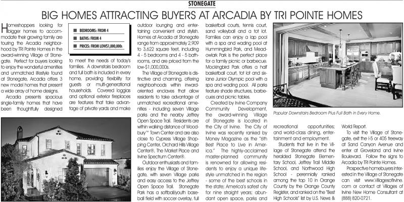 Prospective homebuyers interested in the Village of Stonegate can visit www.VillagesofIrvine. com or contact at Villages of Irvine new Home Consultant at (888) 820-0721.