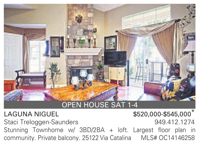 LAGUNA NIGUEL $520,000-$545,000 * Staci Treloggen-Saunders 949.412.1274 Stunning Townhome w/ 3BD/2BA + loft. Largest floor plan in community. Private balcony. 25122 Via Catalina MLS# OC14146258