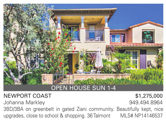 OPEN HOUSE SUN 1-4 NEWPORT COAST $1,275,000 Johanna Markley 949.494.8964