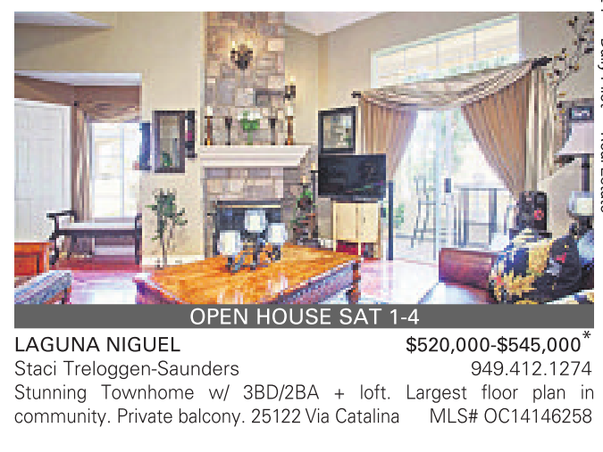 LAGUNA NIGUEL $520,000-$545,000 * Staci Treloggen-Saunders 949.412.1274 Stunning Townhome w/ 3BD/2BA + loft. Largest floor plan in community. Private balcony. 25122 Via Catalina MLS# OC14146258