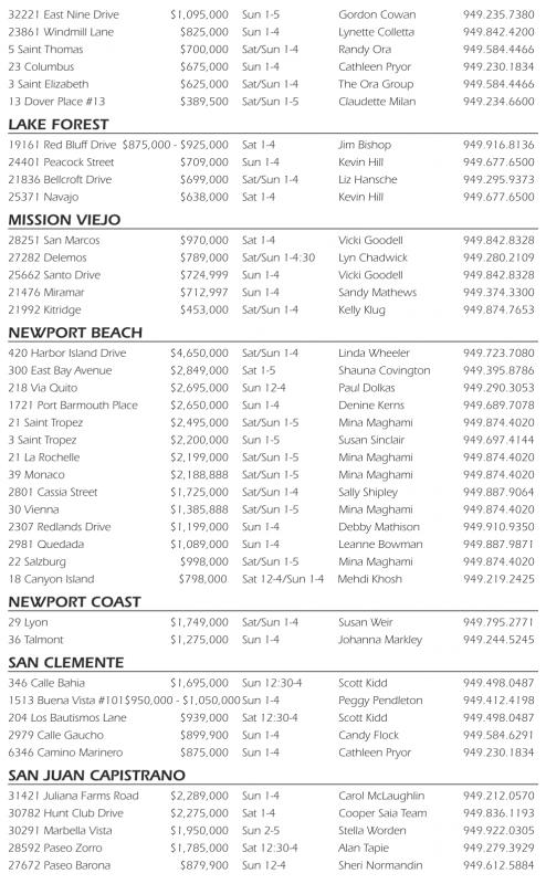 420 Harbor Island Drive $4,650,000 Sat/Sun 1-4 Linda Wheeler 949.723.7080 300 East Bay Avenue $2,849,000 Sat 1-5 Shauna Covington 949.395.8786 218 Via Quito $2,695,000 Sun 12-4 Paul Dolkas 949.290.3053 1721 Port Barmouth Place $2,650,000 Sun 1-4 Denine Kerns 949.689.7078 21 Saint Tropez $2,495,000 Sat/Sun 1-5 Mina Maghami 949.874.4020 3 Saint Tropez $2,200,000 Sun 1-5 Susan Sinclair 949.697.4144 21 La Rochelle $2,199,000 Sat/Sun 1-5 Mina Maghami 949.874.4020 39 Monaco $2,188,888 Sat/Sun 1-5 Mina Maghami 949.874.4020 2801 Cassia Street $1,725,000 Sat/Sun 1-4 Sally Shipley 949.887.9064 30 Vienna $1,385,888 Sat/Sun 1-5 Mina Maghami 949.874.4020 2307 Redlands Drive $1,199,000 Sun 1-4 Debby Mathison 949.910.9350 2981 Quedada $1,089,000 Sun 1-4 Leanne Bowman 949.887.9871 22 Salzburg $998,000 Sat/Sun 1-5 Mina Maghami 949.874.4020 18 Canyon Island $798,000 Sat 12-4/Sun 1-4 Mehdi Khosh 949.219.2425