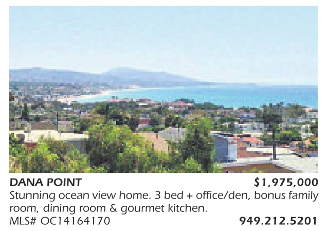 DANA POINT $1,975,000 Stunning ocean view home. 3bed +office/den, bonus family room, dining room & gourmet kitchen. MLS# OC14164170 949.212.5201