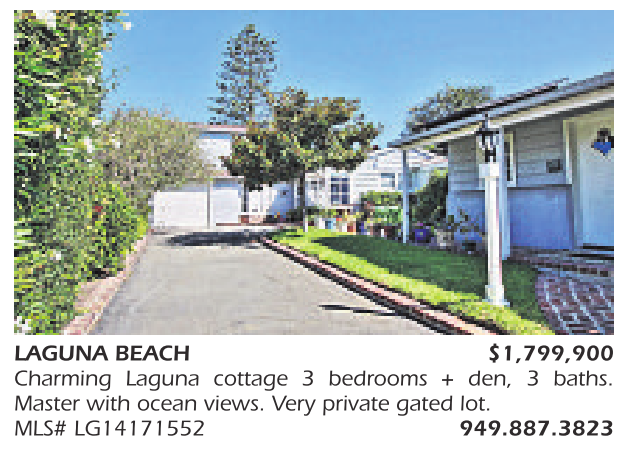 LAGUNA BEACH $1,799,900 Charming Laguna cottage 3 bedrooms + den, 3 baths. Master with ocean views. Very private gated lot. MLS# LG14171552 949.887.3823