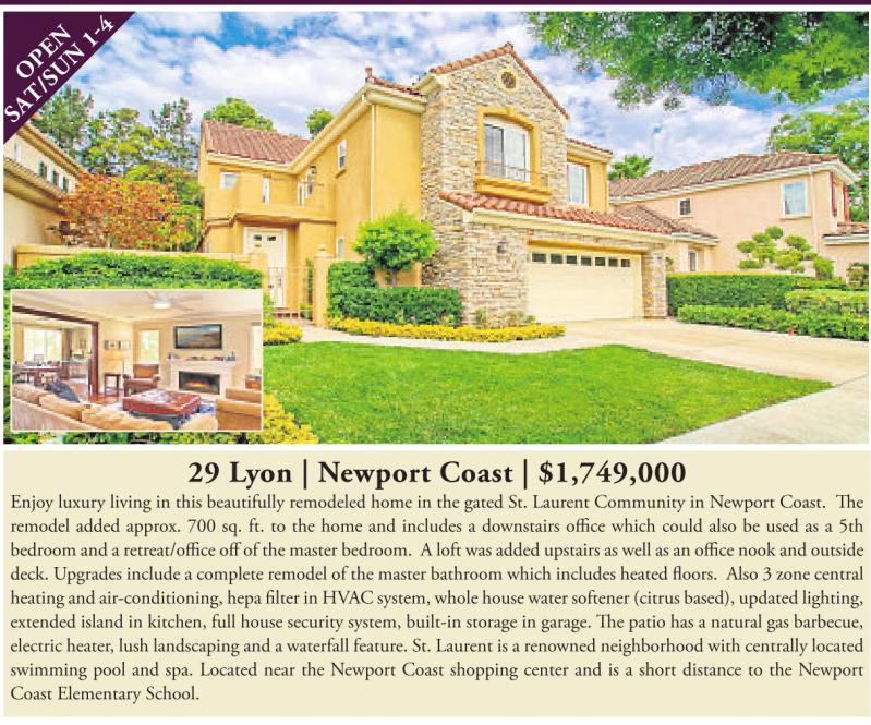 29 Lyon | Newport Coast | $1,749,000 Enjoy luxury living in this beautifully remodeled home in the gated St. Laurent Community in Newport Coast. The remodel added approx. 700 sq. ft. to the home and includes a downstairs office which could also be used as a 5th bedroom and a retreat/office off of the master bedroom. A loft was added upstairs as well as an office nook and outside deck. Upgrades include a complete remodel of the master bathroom which includes heated floors. Also 3 zone central heating and air-conditioning, hepa filter in HVAC system, whole house water softener (citrus based), updated lighting, extended island in kitchen, full house security system, built-in storage in garage. The patio has a natural gas barbecue, electric heater, lush landscaping and a waterfall feature. St. Laurent is a renowned neighborhood with centrally located swimming pool and spa. Located near the Newport Coast shopping center and is a short distance to the Newport Coast Elementary School.