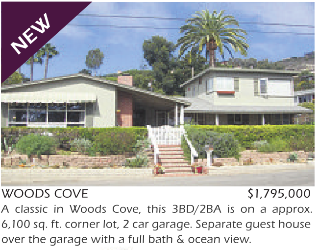 WOODS COVE $1,795,000 A classic in Woods Cove, this 3BD/2BA is on a approx. 6,100 sq. ft. corner lot, 2 car garage. Separate guest house over the garage with a full bath & ocean view.