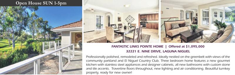 Open House SUN 1-5pm FANTASTIC LINKS POINTE HOME | Offered at $1,095,000 32221 E. NINE DRIVE, LAGUNA NIGUEL Professionally polished, remodeled and refreshed. Ideally nestled on the greenbelt with views of the community parkland and El Niguel Country Club. Three bedroom home features a new gourmet kitchen with stainless steel appliances and designer cabinets, all new bathrooms with custom stone and tile accents. Travertine floors throughout, new lighting and air conditioning. Beautiful turnkey property, ready for new owner!