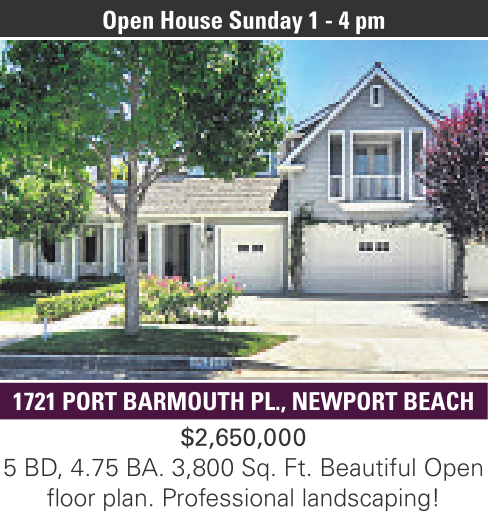 1721 PORT BARMOUTH PL., NEWPORT BEACH $2,650,000 5 BD, 4.75 BA. 3,800 Sq. Ft. Beautiful Open floor plan. Professional landscaping!
