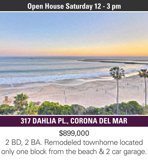 317 DAHLIA PL., CORONA DEL MAR $899,000 2 BD, 2 BA. Remodeled townhome located only one block from the beach & 2 car garage.