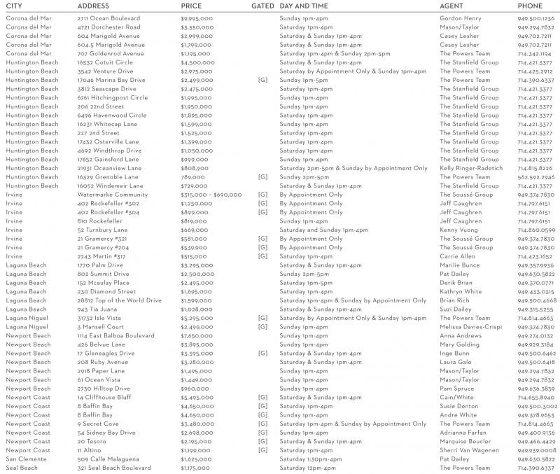 CITY ADDRESS PRICE GATED DAY AND TIME AGENT PHONE Corona del Mar 2711 Ocean Boulevard $9,995,000 Sunday 1pm-4pm Gordon Henry 949.500.1236 Corona del Mar 4721 Dorchester Road $3,550,000 Saturday 1pm-4pm Mason/Taylor 949.294.7832 Corona del Mar 604 Marigold Avenue $2,999,000 Saturday & Sunday 1pm-4pm Casey Lesher 949.702.7211 Corona del Mar 604.5 Marigold Avenue $1,799,000 Saturday & Sunday 1pm-4pm Casey Lesher 949.702.7211 Corona del Mar 707 Goldenrod Avenue $1,195,000 Saturday 1pm-4pm & Sunday 2pm-5pm The Powers Team 714.342.1194 Huntington Beach 16532 Cotuit Circle $4,500,000 Saturday & Sunday 1pm-4pm The Stanfield Group 714.421.3377 Huntington Beach 3542 Venture Drive $2,975,000 Saturday by Appointment Only & Sunday 1pm-4pm The Powers Team 714.425.2912 Huntington Beach 17046 Marina Bay Drive $2,499,000 [G] Sunday 1pm-5pm The Powers Team 714.390.6337 Huntington Beach 3812 Seascape Drive $2,475,000 Saturday 1pm-4pm The Stanfield Group 714.421.3377 Huntington Beach 6761 Hitchingpost Circle $1,995,000 Sunday 1pm-4pm The Stanfield Group 714.421.3377 Huntington Beach 206 22nd Street $1,950,000 Sunday 1pm-4pm The Stanfield Group 714.421.3377 Huntington Beach 6496 Havenwood Circle $1,895,000 Saturday 1pm-4pm The Stanfield Group 714.421.3377 Huntington Beach 16231 Whitecap Lane $1,599,000 Sunday 1pm-4pm The Stanfield Group 714.421.3377 Huntington Beach 227 2nd Street $1,525,000 Saturday 1pm-4pm The Stanfield Group 714.421.3377 Huntington Beach 17432 Osterville Lane $1,399,000 Saturday 1pm-4pm The Stanfield Group 714.421.3377 Huntington Beach 4692 Windthrop Drive $1,050,000 Saturday 1pm-4pm The Stanfield Group 714.421.3377 Huntington Beach 17652 Gainsford Lane $999,000 Sunday 1pm-4pm The Stanfield Group 714.421.3377 Huntington Beach 21931 Oceanview Lane $808,900 Saturday 2pm-5pm & Sunday by Appointment Only Kelly Ringer-Radetich 714.815.8226 Huntington Beach 16329 Grenoble Lane 789,000 [G] Sunday 2pm-5pm The Powers Team 562.592.2946 Huntington Beach 16052 Windemeir Lane $729,000 Saturday & Sunday 1pm-4pm The Stanfield Group 714.421.3377 Irvine Watermarke Community $315,000 – $690,000 [G] By Appointment Only The Soussé Group 949.374.7830 Irvine 402 Rockefeller #302 $1,250,000 [G] By Appointment Only Jeff Caughren 714.797.6151 Irvine 402 Rockefeller #304 $899,000 [G] By Appointment Only Jeff Caughren 714.797.6151 Irvine 810 Rockefeller $819,000 Sunday 1pm-4pm Jeff Caughren 714.797.6151 Irvine 52 Turnbury Lane $669,000 Saturday and Sunday 1pm-4pm Kenny Vuong 714.860.0599 Irvine 21 Gramercy #321 $581,000 [G] By Appointment Only The Soussé Group 949.374.7830 Irvine 21 Gramercy #204 $539,900 [G] By Appointment Only The Soussé Group 949.374.7830 Irvine 2243 Martin #317 $515,000 [G] Saturday 1pm-4pm Carrie Allen 714.423.1652 Laguna Beach 1770 Palm Drive $3,295,000 Saturday & Sunday 1pm-4pm Marilie Bunce 949.357.9936 Laguna Beach 802 Summit Drive $2,500,000 Sunday 2pm-5pm Pat Dailey 949.630.5822 Laguna Beach 152 Mcaulay Place $2,495,000 Saturday 1pm-5pm Derik Brian 949.370.0771 Laguna Beach 230 Diamond Street $1,695,000 Saturday 1pm-4pm Kathryn White 949.433.0315 Laguna Beach 28812 Top of the World Drive $1,599,000 Saturday 1pm-4pm & Sunday by Appointment Only Brian Rich 949.500.4668 Laguna Beach 943 Tia Juana $1,028,000 Saturday & Sunday 1pm-4pm Suzi Dailey 949.315.5255 Laguna Niguel 31732 Isle Vista $5,295,000 [G] Saturday by Appointment Only & Sunday 1pm-4pm The Powers Team 714.814.4663 Laguna Niguel 3 Mansell Court $2,499,000 [G] Sunday 1pm-4pm Melissa Davies-Crispi 949.374.7830 Newport Beach 1114 East Balboa Boulevard $7,650,000 Sunday 1pm-4pm Anna Andrews 949.274.0132 Newport Beach 426 Belvue Lane $3,895,000 Sunday 1pm-4pm Mary Golding 949.929.3184 Newport Beach 17 Gleneagles Drive $3,595,000 [G] Saturday & Sunday 1pm-4pm Inge Bunn 949.500.6462 Newport Beach 208 Ruby Avenue $3,280,000 Saturday & Sunday 1pm-4pm Laura Gale 949.500.6418 Newport Beach 2918 Paper Lane $1,495,000 Sunday 1pm-4pm Mason/Taylor 949.294.7832 Newport Beach 61 Ocean Vista $1,449,000 Sunday 1pm-4pm Mason/Taylor 949.294.7832 Newport Beach 2730 Hilltop Drive $960,000 Sunday 1pm-4pm Pam Spruce 949.636.3859 Newport Coast 14 Cliffhouse Bluff $5,495,000 [G] Saturday & Sunday 1pm-4pm Cain/White 714.655.8940 Newport Coast 8 Baffin Bay $4,650,000 [G] Saturday 1pm-4pm Susie Denton 949.500.3002 Newport Coast 8 Baffin Bay $4,650,000 [G] Sunday 1pm-4pm Andre White 949.378.9653 Newport Coast 9 Secret Cove $3,480,000 [G] Saturday 1pm-4pm & Sunday by Appointment Only The Powers Team 714.814.4663 Newport Coast 54 Sidney Bay Drive $2,698,000 [G] Sunday 1pm-4pm Adrianna Farfan 949.400.9136 Newport Coast 20 Tesoro $2,195,000 [G] Saturday & Sunday 1pm-4pm Marquise Beucler 949.466.4429 Newport Coast 11 Altino $1,199,000 [G] Saturday 1pm-4pm Sherri Van Wagenen 949.939.0008 San Clemente 509 Calle Malaguena $1,625,000 Saturday 1:30pm-4pm Pat Dailey 949.630.5822 Seal Beach 321 Seal Beach Boulevard $1,175,000 Saturday 12pm-4pm The Powers Team 714.390.6337