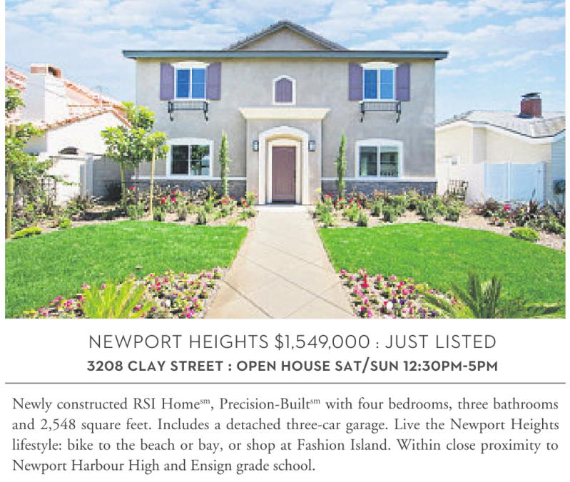 NEWPORT HEIGHTS $1,549,000 : JUST LISTED 3208 CLAY STREET : OPEN HOUSE SAT/SUN 12:30PM-5PM Newly constructed RSI Home sm , Precision-Built sm with four bedrooms, three bathrooms and 2,548 square feet. Includes a detached three-car garage. Live the Newport Heights lifestyle: bike to the beach or bay, or shop at Fashion Island. Within close proximity to Newport Harbour High and Ensign grade school.