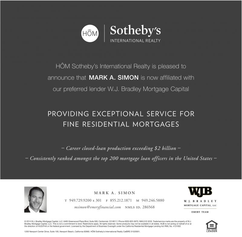 HÔM Sotheby’s International Realty is pleased to announce that MARK A. SIMON is now affiliated with our preferred lender W.J. Bradley Mortgage Capital providing exceptional service for fine residential mortgages – Career closed-loan production exceeding $2 billion – – Consistently ranked amongst the top 200 mortgage loan officers in the United States – M A R K A . S I M O N t 949.729.9200 x 301 f 855.212.1871 m 949.246.5880 msimon@emeryfinancial.com nmls id. 286568 ©2014 W.J. Bradley Mortgage Capital, LLC. 6465 Greenwood Plaza Blvd, Suite 500, Centennial, CO 80111 Phone #303-825-5670. NMLS ID 3233. Trade/service marks arethe property of W.J. Bradley Mortgage Capital, LLC. This is not acommitment to lend. Restrictions apply. All rights reserved. Some products may not be available in all states. WJB is not acting on behalf of or at the direction of HUD/FHA or the federal government. Licensed by the Department of Business Oversight under the California Residential Mortgage Lending Act RML No. 4131002 1200 Newport Center Drive, Suite 100, Newport Beach, California 92660. HÔM Sotheby’s International Realty CalBRE 01520001.