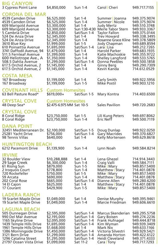 BIG CANYON 3 Cypress Point Lane $4,850,000 Sun 1-4 Carol | Cheri 949.717.7155 CORONA DEL MAR 4539 Camden Drive $6,525,000 Sat 1-4 Summer | Joanna 949.375.9074 4539 Camden Drive $6,525,000 Sun 1-4 Summer | Nicole 949.375.9074 609 Marigold Avenue $3,300,000 Sat 1-4 Judy Mertz 949.510.3748 609 Marigold Avenue $3,300,000 Sun 1:30-4:30 Merle Tabor Stern 949.933.3367 5 Cambria Drive $2,850,000 Sat/Sun 1-4 Taylor Fallon 949.375.0144 524 De Anza Drive $2,345,000 Sat 1-4 Trev Howard 949.338.3495 524 De Anza Drive $2,345,000 Sun 1-4 RosanneGrace Kline 949.378.5809 3610 Blue Key $1,999,000 Sat 1-5 Jody Chapman 949.689.8594 610 Poinsettia Avenue $1,695,000 Sat/Sun 1-4 Lara | Lisa 949.212.7265 3741 DaffodilAvenue, 94 $1,479,000 Sat 1-4 Harold Parker 949.683.1935 511.5 Fernleaf Avenue $1,399,000 Sun 1-4 Katie Machoskie 949.355.9722 600 Heliotrope Ave., A $1,350,000 Sun 1-4 Shelley Langford 949.533.5765 508.5 Dahlia Avenue $1,299,000 Sat/Sun 1-4 Donna Peebles 949.500.1858 617.5 Orchid Avenue, 2 $1,145,000 Sat 1-4 Ginny Berg 949.290.7309 617.5 Orchid Avenue, 2 $1,145,000 Sun 1-4 Kevin Kanda 714.612.0529 COSTA MESA 167 Broadway $1,199,000 Sat 1-4 Carly Smith 949.922.5956 167 Broadway $1,199,000 Sun 1-5 Mike Postil 949.903.1210 COVENANT HILLS Custom Homesites 63 Bell Pasture Road* $619,000+ Sat/Sun 1-5 Mary Kontra 714.403.6500 CRYSTAL COVE Custom Homesites 48 Deep Sea* $2.475-6.975 MM Sat 10-5 Sales Pavilion 949.720.2683 CRYSTAL COVE 8 Coral Ridge $23,750,000 Sat 1-5 Lili Kung Peters 949.697.8062 8 Coral Ridge $23,750,000 Sun 1-4 Eric Neff 949.500.7119 DANA POINT 32451 Mediterranean Dr. $2,100,000 Sat/Sun 1-5 Doug Dunlap 949.922.0250 25281 Yacht Drive $756,000 Sat/Sun 1-4 Gary Macrides 949.370.6827 98 Tennis Villas $640,000 Sat 1-4 Kelly Mortensen 949.629.8618 HUNTINGTON BEACH 6212 Pacemont Drive $1,139,900 Sun 1-4 Lynn Noah 949.584.8214 IRVINE 32 Boulder View $10,288,888 Sat 1-4 Lena Ghezel 714.914.3443 29 Sage Creek $6,300,000 Sun 1-4 Craig Valli 949.584.7111 61 Rising Sun $879,000 Sun 1-5 Mike | Mary 949.857.5400 2 Iroquois Court $778,800 Sun 1-4 Matthew | Stacy 714.401.0878 720 Rockefeller $750,000 Sat 1-5 Mike | Mary 949.857.5400 59 Arcata $690,000 Sun 1-4 Matthew | Stacy 714.401.0878 202 Coral Rose $665,000 Sat/Sun 1-4 Dianne Allen 949.280.6200 14 El Cajon $625,000 Sat 1-4 Matthew | Stacy 714.401.0878 17 Courant $429,900 Sun 1-5 Mike | Mary 949.857.5400 LADERA RANCH 19 Scarlet Maple Drive $1,049,000 Sat 1-4 Denise Murphy 949.395.9461 19 Scarlet Maple Drive $1,049,000 Sun 1-4 Marcie Friedman 949.606.6610 LAGUNA BEACH 505 Dunnegan Drive $2,595,000 Sat/Sun 1-4 Marcus Skenderian 949.295.5758 990 Del Mar Avenue $2,195,000 Sat/Sun 1-4 Gary Boisen 949.274.2236 1165 Skyline Drive $2,095,000 Sat/Sun 1-4 Frank Hufnagel 949.444.8718 1439 Temple Hills Drive $1,695,000 Sat/Sun 1-4 Kim Wyman 949.939.3409 1961 Temple Hills Drive $1,668,000 Sat 1-4 Mark Nix 949.633.1166 1386 Morningside Drive $1,450,000 Sat/Sun 1-4 Victoria Silvestri 949.929.5421 3121 Bern Drive $1,299,000 Sat/Sun 1-4 Amanda Horton 949.422.6122 1296 Catalina Street $1,295,000 Sat/Sun 1-4 Heidi Cleveland 949.371.4333 21797 Ocean Vista Drive $1,099,000 Sat 11-2 Cara | Tony 949.717.7293