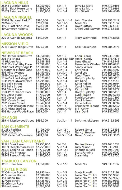 LAGUNA HILLS 25241 Buckskin Drive $2,250,000 Sat 1-4 Jerry La Mott 949.472.9191 25151 Black Horse Lane $1,595,000 Sun 1-4 Jerry La Mott 949.472.9191 25671 Raintree Road $1,295,000 Sun 1-4 Kim Gillett 949.344.6740 LAGUNA NIGUEL 31801 National Park Dr. $990,000 Sat/Sun 1-4 John Treviño 949.395.2417 20 Windcrest $768,000 Sat 12-5 Mark Nix 949.633.1166 31591 East Nine Drive $528,000 Sun 1-4 Joyce Sutton 949.637.4839 40 Cameray Heights $509,900 Sun 1-4 Christi Cecil-Stewart 949.973.5685 LAGUNA WOODS 229 D Avenida Majorca $449,999 Sat 1-4 Tracy Weintraub 949.874.8568 MISSION VIEJO 27161 South Ridge Drive $875,000 Sat 1-4 Kelli Haakenson 949.584.2176 NEWPORT BEACH 748 Harbor Island Drive $4,950,000 Sat 1-5 Cheri | Carol 949.233.7600 203 Via Ithaca $3,975,000 Sun 1:30-4:30 Amie | Kandy 949.375.4171 11 Hidden Pass $3,588,888 Sun 1-4 Lena Ghezel 714.914.3443 2421 Port Whitby Place $2,598,000 Sun 1-4 Bernadette Whelan 949.280.6852 2042 Port Weybridge Pl. $2,500,000 Sun 1-4 Sandy Wilcox 949.439.4424 6 Summer House Lane $2,475,000 Sun 1-4 Chris Valli 714.883.4397 406 Aliso Avenue $2,450,000 Sat/Sun 1-4 Carol Lee 949.395.3994 2939 Catalpa Street $2,385,000 Sun 1-4 Cyndi Terry 949.302.0220 1954 Port Locksleigh Pl. $2,325,000 Sun 1-4 Holly Duplanty 949.300.5118 1935 Port Edward Place $2,295,000 Sun 1-4 Jim Kline 949.717.7123 815 Bellis Street $1,895,000 Sat 1-4 Katie Rollins 949.293.0594 815 Bellis Street $1,895,000 Sun 1-4 Carol Allison 949.500.5084 914 Citrus Place $1,890,000 Appt. Only Kathy | Bill 949.887.0972 1814 Port Charles Place $1,880,000 Sat 1-4 Holly Duplanty 949.300.5118 915 Citrus Place $1,739,000 Sat 1-4 Cyndi | Katie 949.500.5084 915 Citrus Place $1,739,000 Sun 1-4 Patricia Carson 949.922.7399 2921 Cassia Street $1,649,000 Sat 1-4 Carol Allison 949.293.0594 2921 Cassia Street $1,649,000 Sun 1-4 Katie Rollins 949.293.0594 1972 Port RamsgatePlace $1,649,000 Sat 1-4 Bernadette | Laurie 949.280.6852 2179 Vista Entrada $1,200,000 Appt. Only Bill | Kathy 949.923.1205 402 Harbor Woods Place $559,000 Sat 1-4 Lisa | Dani 949.887.1013 ORANGE 239N.MaplewoodStreet $699,000 Sat/Sun 1-4 DeAnne Jakobsen 949.212.8699 SAN CLEMENTE 5 Calle Pacifica $1,199,000 Sun 12-4 Robert Gmur 949.310.5195 2303 Via Zafiro $825,000 Sat 1-4:30 Nancy | Heather 949.606.6116 2701 Calle Del Comercio $424,900 Sat/Sun 1-4 Neven Spralja 949.233.3625 SAN JUAN CAPISTRANO 32121 Cook Lane $5,750,000 Sat 2-5 Nadine | Nancy 949.463.1033 30871 Steeplechase Drive $2,255,000 Sun 1-4 Judy Minor 949.533.2403 28532 Camino La Ronda $1,775,000 Sun 12-3 Rhonda Russell 949.395.7399 27322 Via Priorato $1,375,000 Sat 1-4 Scott Panning 949.422.6792 28242 Paseo Andante $1,285,000 Sat 12-3 Susan Irby 310.753.3750 TRABUCO CANYON 31101 Hamilton $3,850,000 Sun 12-5 Mark Nix 949.633.1166 TURTLE RIDGE 27 Crimson Rose $6,995/mo. Sun 2-5 Sonja Powell 949.510.1186 47 Summer House $2,588,000 Sun 2-5 Joele “Jojo” | Jim 949.350.9363 35 Hidden Trail $2,499,000 Sun 2-5 Joele “Jojo” | Jim 949.350.9363 42 Woodcrest $2,425,000 Sun 2-5 Joele “Jojo” | Jim 949.350.9363 48 Crimson Rose $2,395,000 Sun 2-5 Joele “Jojo” | Jim 949.350.9363 36 Hedgerow $1,798,000 Sun 2-5 Joele “Jojo” | Jim 949.350.9363