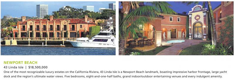 NEWPORT BEACH 43 Linda Isle | $18,500,000 One of the most recognizable luxury estates on the California Riviera, 43 Linda Isle is a Newport Beach landmark, boasting impressive harbor frontage, large yacht dock and the region’s ultimate water views. Five bedrooms, eight-and-one-half baths, grand indoor/outdoor entertaining venues and every indulgent amenity. See also