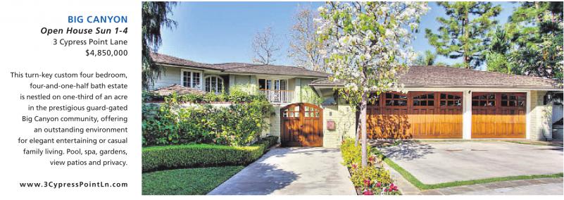 BIG CANYON Open House Sun 1-4 3 Cypress Point Lane $4,850,000 This turn-key custom four bedroom, four-and-one-half bath estate is nestled on one-third of an acre in the prestigious guard-gated Big Canyon community, offering an outstanding environment for elegant entertaining or casual family living. Pool, spa, gardens, view patios and privacy. www.3CypressPointLn.com