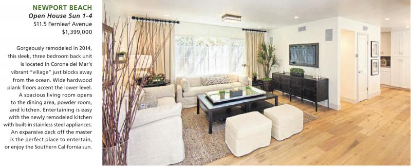 NEWPORT BEACH Open House Sun 1-4 511.5 Fernleaf Avenue $1,399,000 Gorgeously remodeled in 2014, this sleek, three bedroom back unit is located in Corona del Mar’s vibrant “village” just blocks away from the ocean. Wide hardwood plank floors accent the lower level. A spacious living room opens to the dining area, powder room, and kitchen. Entertaining is easy with the newly remodeled kitchen with built-in stainless steel appliances. An expansive deck off the master is the perfect place to entertain, or enjoy the Southern California sun.