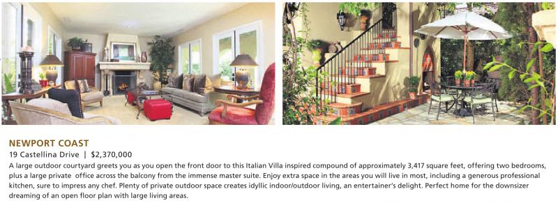 NEWPORT COAST 19 Castellina Drive | $2,370,000 A large outdoor courtyard greets you as you open the front door to this Italian Villa inspired compound of approximately 3,417 square feet, offering two bedrooms, plus a large private office across the balcony from the immense master suite. Enjoy extra space in the areas you will live in most, including a generous professional kitchen, sure to impress any chef. Plenty of private outdoor space creates idyllic indoor/outdoor living, an entertainer’s delight. Perfect home for the downsizer dreaming of an open floor plan with large living areas.