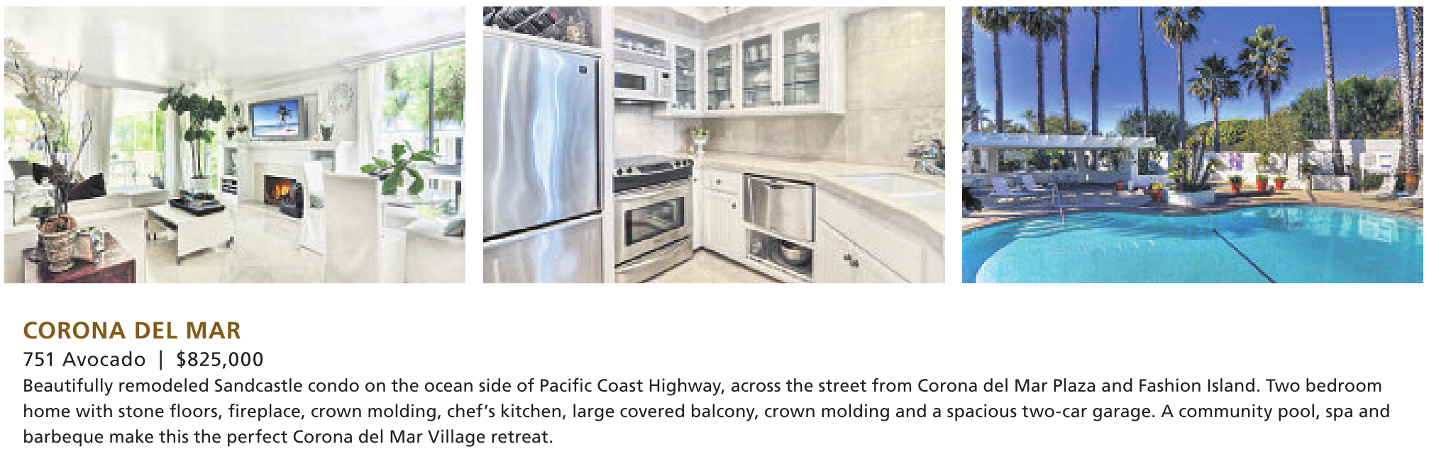 CORONA DEL MAR 751 Avocado | $825,000 Beautifully remodeled Sandcastle condo on the ocean side of Pacific Coast Highway, across the street from Corona del Mar Plaza and Fashion Island. Two bedroom home with stone floors, fireplace, crown molding, chef’s kitchen, large covered balcony, crown molding and a spacious two-car garage. A community pool, spa and barbeque make this the perfect Corona del Mar Village retreat. See also