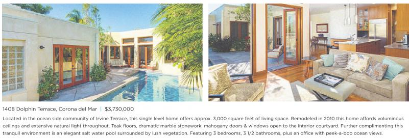 1408 Dolphin Terrace, Corona del Mar | $3,730,000 Located in the ocean side community of Irvine Terrace, this single level home offers approx. 3,000 square feet of living space. Remodeled in 2010 this home affords voluminous ceilings and extensive natural light throughout. Teak floors, dramatic marble stonework, mahogany doors & windows open to the interior courtyard. Further complimenting this tranquil environment is an elegant salt water pool surrounded by lush vegetation. Featuring 3 bedrooms, 3 1/2 bathrooms, plus an office with peek-a-boo ocean views.