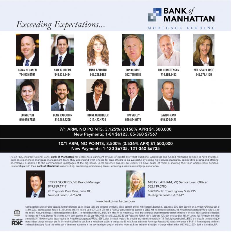 Cannot combine with any other specials. Payment examples do not include taxes and insurance premiums; actual payment amount will be greater.Example #1 assumes a30% down payment on a30-year PURCHASE loan of $1,500,000; 7-year Adjustable-Rate at 3.125% (rate) and 70% loan-to-value (LTV), 38% DTI, with a760 FICO score; first initial payment is $6123 with no points due at closing, the Annual Percentage rate (APR) is 3.158%. after the initial 7years, the principal and interest payment is $7567. The fully indexed rate of 2.875% is in effect for the remaining 23 years and can change once every year for the remaining life of the loan. Rate is variable and subject to change after 7years. Example #2 assumes a30% down payment on a30-year PURCHASE loan of $1,500,000; 10-year Adjustable-Rate at 3.50% (rate) and 70% loan-to-value (LTV), 38% DTI, with a760 FICO score; first initial payment is $6735 with no points due at closing, the Annual Percentage rate (APR) is 3.536%. after the initial 10 years, the principal and interest payment is $6735. The fully indexed rate of 2.875% is in effect for the remaining 20 years and can change once every year for the remaining life of the loan. Rate is variable and subject to change after 10 years. Rates and Annual Percentage Rates (APR )stated above are as of 8/18/14. Terms may vary,conditions and restrictions apply.Actual rate for the loan is determined at the time of rate lock based upon program and terms requested. Rates and terms are subject to change without notice. NMLS #40122 2014 Bank of Manhattan, N.A.