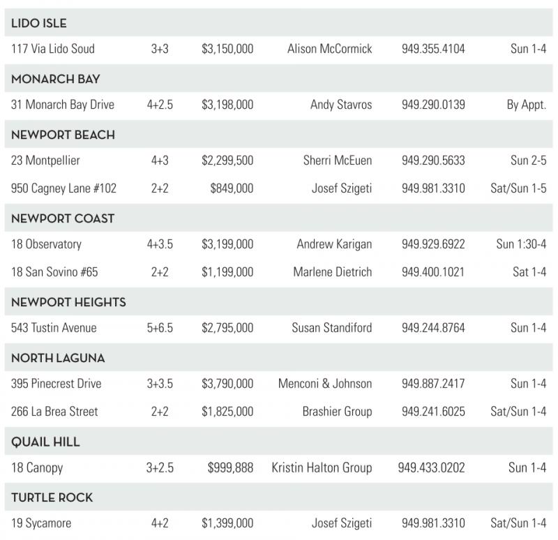19 Sycamore 4+2 $1,399,000 Josef Szigeti 949.981.3310 Sat/Sun 1-4
