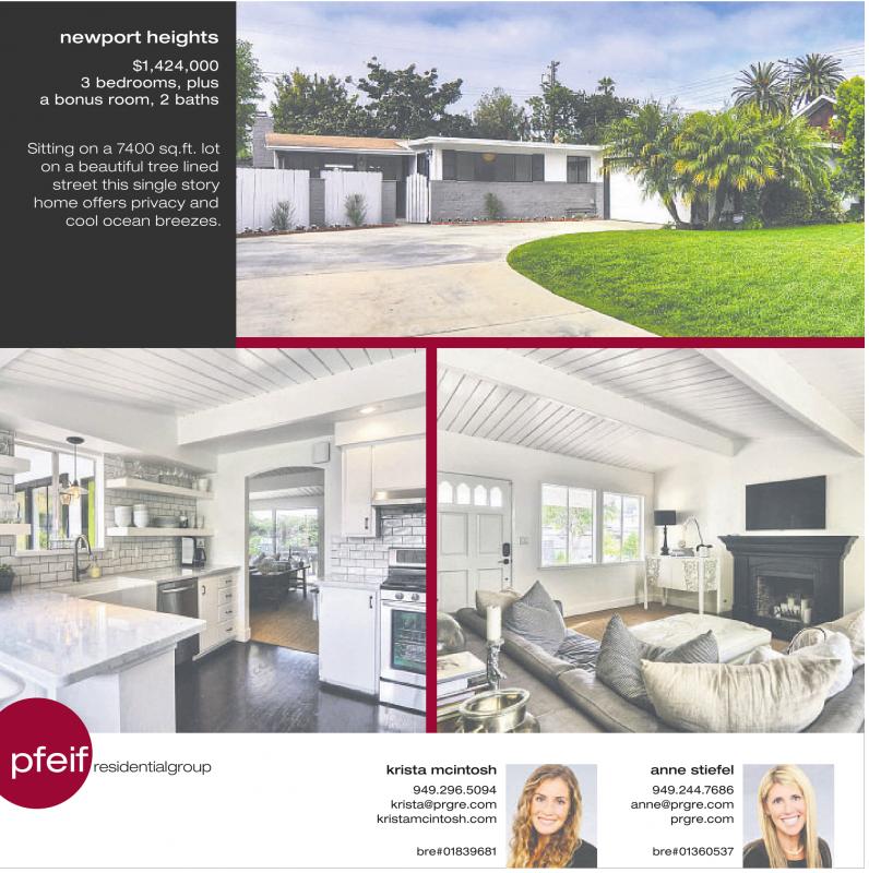 newport heights $1,424,000 3 bedrooms, plus a bonus room, 2 baths Sitting on a 7400 sq.ft. lot on a beautiful tree lined street this single story home offers privacy and cool ocean breezes. krista mcintosh 949.296.5094 krista@prgre.com kristamcintosh.com anne stiefel 949.244.7686 anne@prgre.com prgre.com bre#01839681 bre#01360537