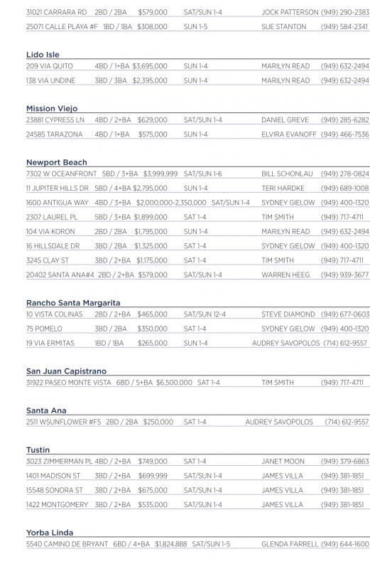 Newport Beach 7302 WOCEANFRONT 5BD /3+BA $3,999,999 SAT/SUN 1-6 BILL SCHONLAU (949) 278-0824 11 JUPITER HILLS DR 5BD /4+BA $2,795,000 SUN 1-4 TERI HARDKE (949) 689-1008 1600 ANTIGUAWAY 4BD /3+BA $2,000,000-2,350,000 SAT/SUN 1-4 SYDNEY GIELOW (949) 400-1320 2307LAUREL PL 5BD /3+BA $1,899,000 SAT1-4 TIM SMITH (949) 717-4711 104 VIA KORON 2BD /2BA $1,795,000 SUN 1-4 MARILYN READ (949) 632-2494 16 HILLSDALE DR 3BD /2BA $1,325,000 SAT1-4 SYDNEY GIELOW (949) 400-1320 3245 CLAYST 3BD /2+BA $1,175,000 SAT1-4 TIM SMITH (949) 717-4711 20402SANTAANA#4 2BD /2+BA $579,000 SAT/SUN 1-4 WARREN HEEG (949) 939-3677