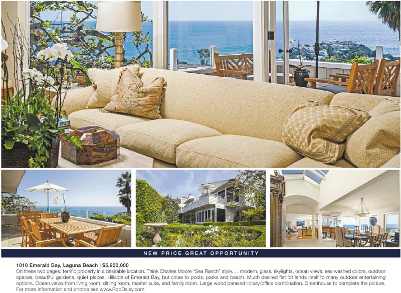 N E W P R I C E G R E AT O P P O R T U N I T Y 1010 Emerald Bay, Laguna Beach | $5,900,000 On these two pages, terrific property in a desirable location. Think Charles Moore “Sea Ranch” style. . . modern, glass, skylights, ocean views, sea washed colors, outdoor spaces, beautiful gardens, quiet places. Hillside of Emerald Bay, but close to pools, parks and beach. Much desired flat lot lends itself to many outdoor entertaining options. Ocean views from living room, dining room, master suite, and family room. Large wood paneled library/office combination. Greenhouse to complete the picture. For more information and photos see www.RodDaley.com
