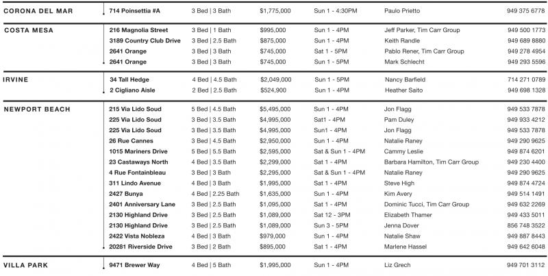 NEWPORT BEACH 215 Via Lido Soud 5 Bed | 4.5 Bath $5,495,000 Sun 1 - 4PM Jon Flagg 949 533 7878 225 Via Lido Soud 3 Bed | 3.5 Bath $4,995,000 Sat1 - 4PM Pam Duley 949 933 4212 225 Via Lido Soud 3 Bed | 3.5 Bath $4,995,000 Sun1 - 4PM Jon Flagg 949 533 7878 26 Rue Cannes 3 Bed | 4.5 Bath $2,950,000 Sun 1 - 4PM Natalie Raney 949 290 9625 1015 Mariners Drive 5 Bed | 5.5 Bath $2,595,000 Sat & Sun 1 - 4PM Cammy Leslie 949 874 6201 23 Castaways North 4 Bed | 3.5 Bath $2,299,000 Sat 1 - 4PM Barbara Hamilton, Tim Carr Group 949 230 4400 4 Rue Fontainbleau 3 Bed | 3 Bath $2,295,000 Sat & Sun 1 - 4PM Natalie Raney 949 290 9625 311 Lindo Avenue 4 Bed | 3 Bath $1,995,000 Sat 1 - 4PM Steve High 949 874 4724 2427 Bunya 4 Bed | 2.25 Bath $1,635,000 Sun 1 - 4PM Kim Avery 949 514 1491 2401 Anniversary Lane 3 Bed | 2.5 Bath $1,095,000 Sat 1 - 4PM Dominic Tucci, Tim Carr Group 949 632 2269 2130 Highland Drive 3 Bed | 2.5 Bath $1,089,000 Sat 12 - 3PM Elizabeth Thamer 949 433 5011 2130 Highland Drive 3 Bed | 2.5 Bath $1,089,000 Sun 3 - 5PM Jenna Dover 856 748 3522 2422 Vista Nobleza 4 Bed | 3 Bath $979,000 Sun 1 - 4PM Natalie Shaw 949 887 8443 20281 Riverside Drive 3 Bed | 2 Bath $895,000 Sat 1 - 4PM Marlene Hassel 949 642 6048