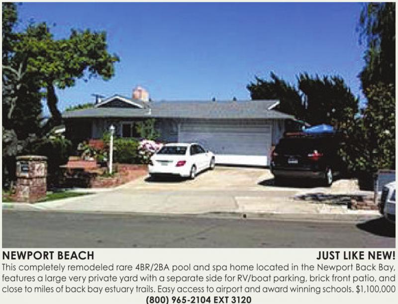 NEWPORT BEACH JUST LIKE NEW! This completely remodeled rare 4BR/2BA pool and spa home located in the Newport Back Bay, features alarge very privateyardwithaseparate side forRV/boat parking,brick frontpatio,and close to milesofbackbay estuarytrails. Easy access to airportand awardwinning schools. $1,100,000 (800) 965-2104 EXT 3120 See also