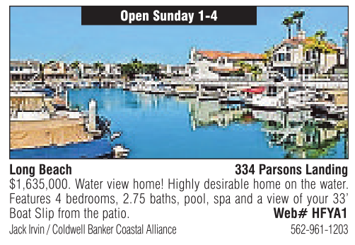 Open Sunday 1-4 Long Beach 334 Parsons Landing $1,635,000. Water view home! Highly desirable home on the water. Features 4 bedrooms, 2.75 baths, pool, spa and a view of your 33’ Boat Slip from the patio. Web# HFYA1 Jack Irvin /Coldwell Banker Coastal Alliance 562-961-1203