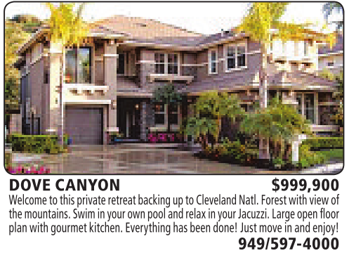 DOVE CANYON $999,900 Welcome to this private retreat backinguptoClevelandNatl. Forest with view of themountains.Swiminyour ownpooland relaxinyour Jacuzzi.Large openfloor plan with gourmet kitchen. Everythinghas beendone!Just move in andenjoy! 949/597-4000