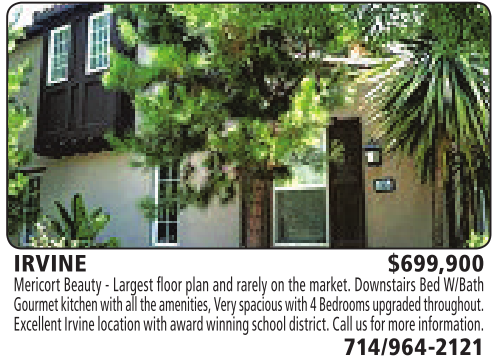 IRVINE $699,900 Mericort Beauty -Largest floor plan and rarely on the market. Downstairs Bed W/Bath Gourmet kitchen with allthe amenities, Very spacious with 4Bedrooms upgraded throughout. ExcellentIrvinelocationwithaward winningschool district.Callusfor more information. 714/964-2121
