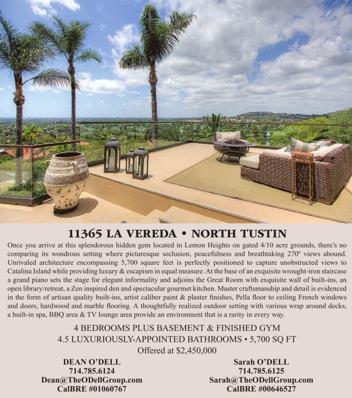 11365 LA VEREDA • NORTH TUSTIN Once you arrive at this splendorous hidden gem located in Lemon Heights on gated 4/10 acre grounds, there’s no comparing its wondrous setting where picturesque seclusion, peacefulness and breathtaking 270º views abound. Unrivaled architecture encompassing 5,700 square feet is perfectly positioned to capture unobstructed views to Catalina Island while providing luxury & escapism in equal measure. At the base of an exquisite wrought-iron staircase a grand piano sets the stage for elegant informality and adjoins the Great Room with exquisite wall of built-ins, an open library/retreat, a Zen inspired den and spectacular gourmet kitchen. Master craftsmanship and detail is evidenced in the form of artisan quality built-ins, artist caliber paint & plaster finishes, Pella floor to ceiling French windows and doors, hardwood and marble flooring. A thoughtfully realized outdoor setting with various wrap around decks, a built-in spa, BBQ area & TV lounge area provide an environment that is a rarity in every way. 4 BEDROOMS PLUS BASEMENT & FINISHED GYM 4.5 LUXURIOUSLY-APPOINTED BATHROOMS • 5,700 SQ FT Offered at $2,450,000 DEAN O’DELL 714.785.6124 Dean@TheODellGroup.com CalBRE #01060767 Sarah O’DELL 714.785.6125 Sarah@TheODellGroup.com CalBRE #00646527