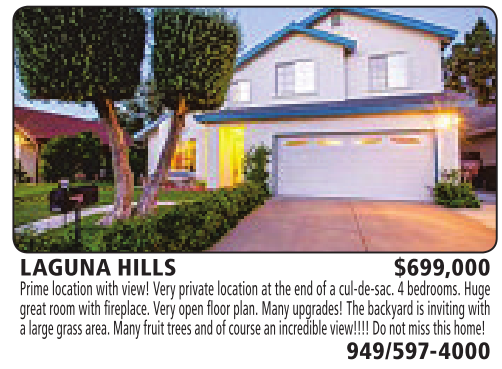 LAGUNA HILLS $699,000 Prime location with view! Very private location at the end of acul-de-sac. 4bedrooms. Huge great room with fireplace. Very open floor plan. Many upgrades! The backyard is inviting with alarge grassarea. Manyfruit trees andofcourse an incredible view!!!! Do notmissthis home!