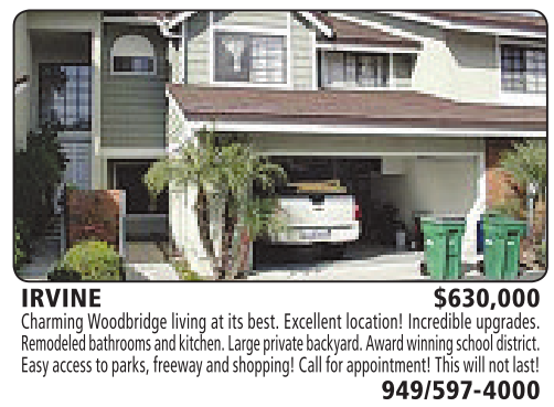 IRVINE $630,000 Charming Woodbridge living at its best. Excellent location! Incredible upgrades. Remodeledbathrooms andkitchen. Large privatebackyard. Awardwinningschool district. Easy access to parks, freeway andshopping! Call for appointment! This will notlast! 949/597-4000 See also