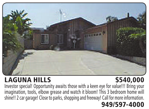 LAGUNA HILLS $540,000 Investor special! Opportunity awaits those with akeen eye for value!!! Bring your imagination, tools, elbow grease and watch itbloom! This 3bedroom home will shine!!2car garage! Close to parks, shoppingand freeway!Callfor more information.