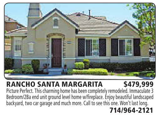 RANCHO SANTA MARGARITA $479,999 PicturePerfect.This charminghome hasbeencompletelyremodeled. Immaculate3 Bedroom/2Baend unit groundlevel home w/fireplace.Enjoy beautifullandscaped backyard,two cargarageand muchmore.Calltosee this one.Won’t last long. 714/964-2121 See also