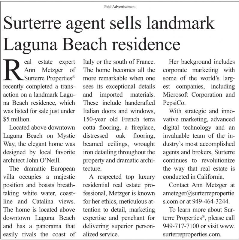 estate expert Ann Metzger of Surterre Properties ® recently completed a transaction on a landmark Laguna Beach residence, which was listed for sale just under $5 million.
