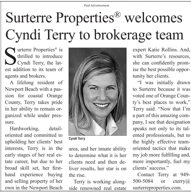 “I was initially drawn to Surterre because it was voted one of Orange County’s best places to work,” Terry said. “Now that I’m a part of this amazing company, I see that designation speaks not only to its talented professionals, but to the highly effective teamoriented tactics that make my job more fulfilling and, more importantly, fuel my clients’ success.”