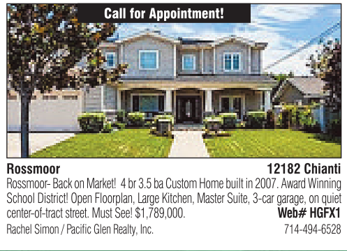 Rossmoor Call for Appointment! 12182 Chianti Rachel Simon /Pacific Glen Realty,Inc. 714-494-6528 Rossmoor-Back on Market! 4br3.5 ba Custom Home built in 2007. AwardWinning School District! Open Floorplan, LargeKitchen, Master Suite, 3-car garage, on quiet center-of-tract street. Must See! $1,789,000. Web# HGFX1