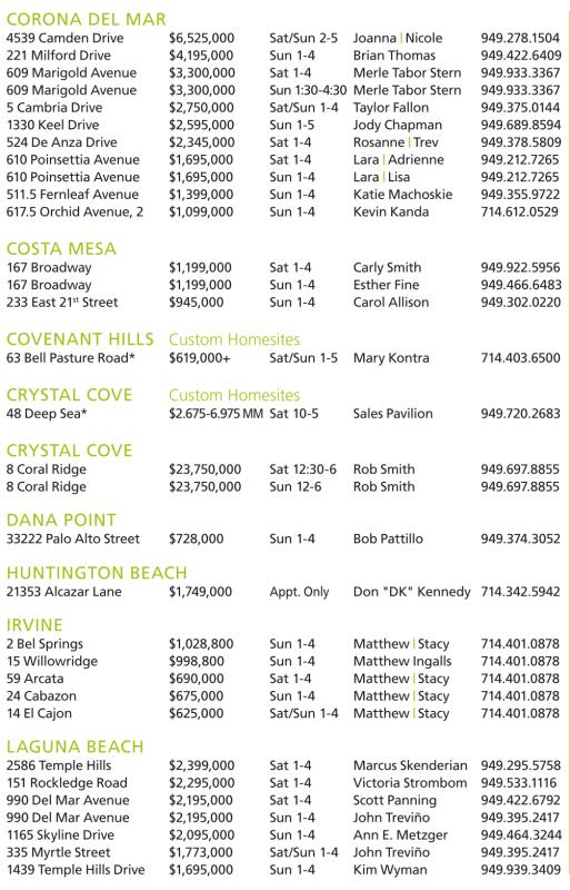 4539 CamdenDrive $6,525,000 Sat/Sun 2-5 Joanna | Nicole 949.278.1504 221Milford Drive $4,195,000 Sun 1-4 Brian Thomas 949.422.6409 609 Marigold Avenue $3,300,000 Sat 1-4 MerleTabor Stern 949.933.3367 609 Marigold Avenue $3,300,000 Sun 1:30-4:30 Merle TaborStern 949.933.3367 5Cambria Drive $2,750,000 Sat/Sun 1-4 TaylorFallon 949.375.0144 1330 Keel Drive $2,595,000 Sun 1-5 Jody Chapman 949.689.8594 524DeAnzaDrive $2,345,000 Sat 1-4 Rosanne | Trev 949.378.5809 610PoinsettiaAvenue $1,695,000 Sat 1-4 Lara | Adrienne 949.212.7265 610PoinsettiaAvenue $1,695,000 Sun 1-4 Lara | Lisa 949.212.7265 511.5FernleafAvenue $1,399,000 Sun 1-4 Katie Machoskie 949.355.9722 617.5Orchid Avenue,2 $1,099,000 Sun 1-4 Kevin Kanda 714.612.0529